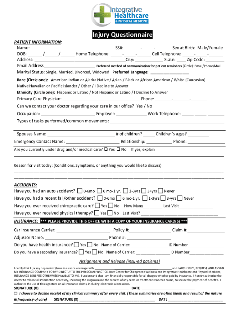 Injury Questionnaire PATIENT INFORMATION: Name: ___ SS#: _________ Sex at Birth: Male/Female DOB: ___ /___/___ Home Telephone: _________ Cell Telephone: _________ Address: ___City: ___ State: ___