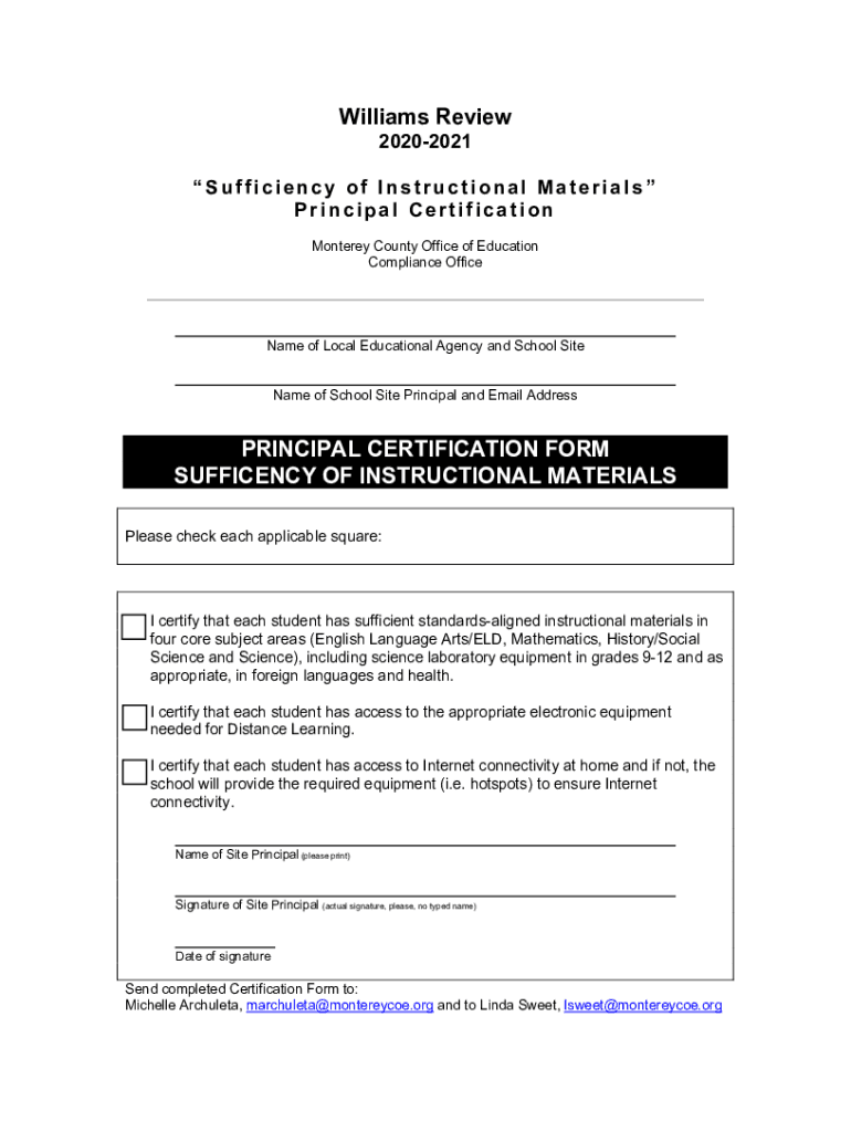 Williams Review 20202021 Sufficiency of Instructional Materials Principal Certification Monterey County Office of Education Compliance Filename of Local Educational Agency and School Site Name of