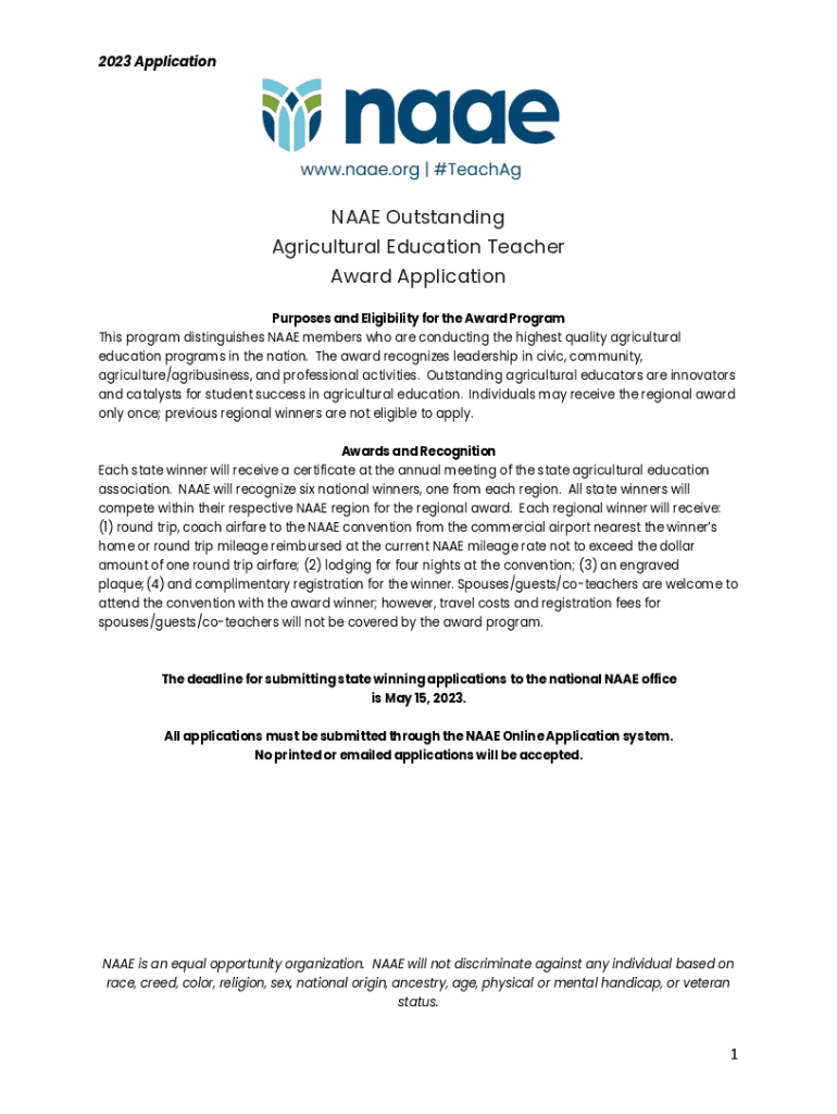 2023 ApplicationNAAE Outstanding Agricultural Education Teacher Award Application Purposes and Eligibility for the Award Program This program distinguishes NAME members who are conducting the highest