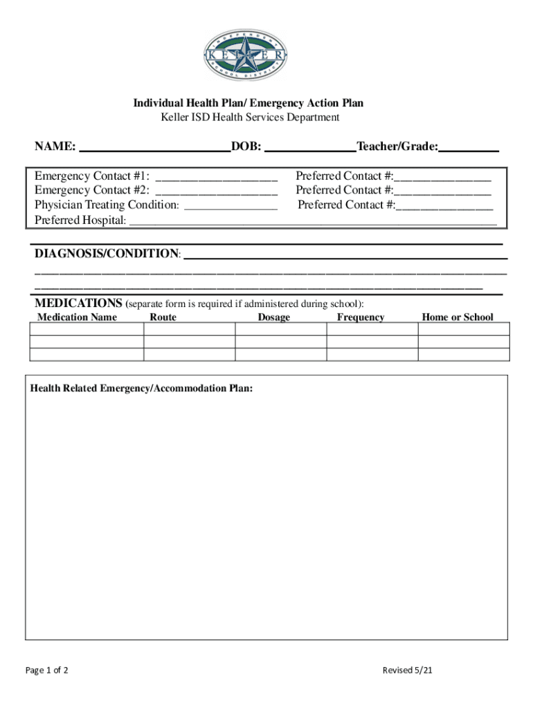 Individual Health Plan/ Emergency Action Plan Keller ISD Health Services Departmental:DOB:Teacher/Grade:Emergency Contact #1: ___ Preferred Contact #:___ Emergency Contact #2: ___ Preferred Contact