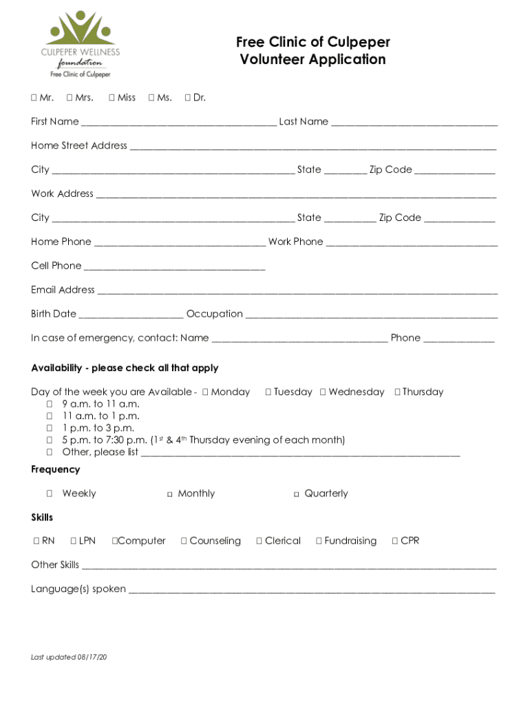 Free Clinic of Upper Volunteer Application Mr. Mrs. Miss Ms. Dr. First Name ___ Last Name ___ Home Street Address ___ City ___ State ___ Zip Code ___ Work Address ___ City ___ State ___ Zip Code ___