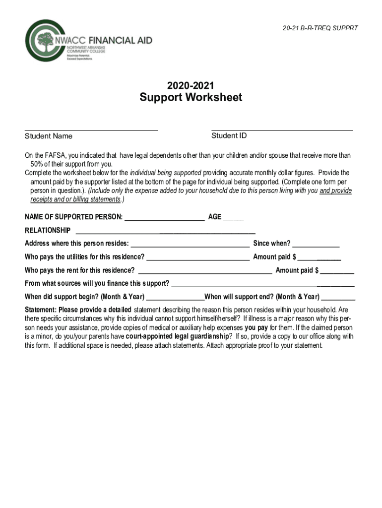 2021 BROTHER SUPPRT20202021Support Worksheet ___ Student ID___ Student Name the FAFSA, you indicated that have legal dependents other than your children and/or spouse that receive more than 50% of