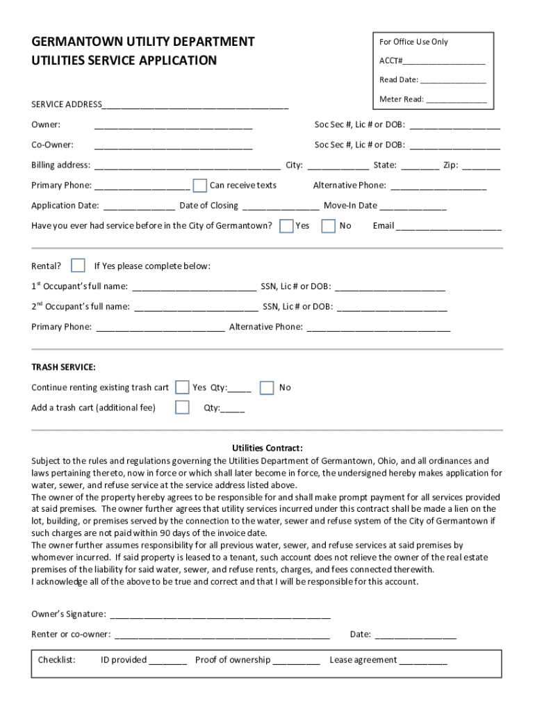 GERMANTOWN UTILITY DEPARTMENT UTILITIES SERVICE Application Office Use Only ACCT#___ Read Date: ___ Meter Read: ___SERVICE ADDRESS___ Owner:___Soc Sec #, LIC # or DOB: ___Corner:___Soc Sec #, LIC