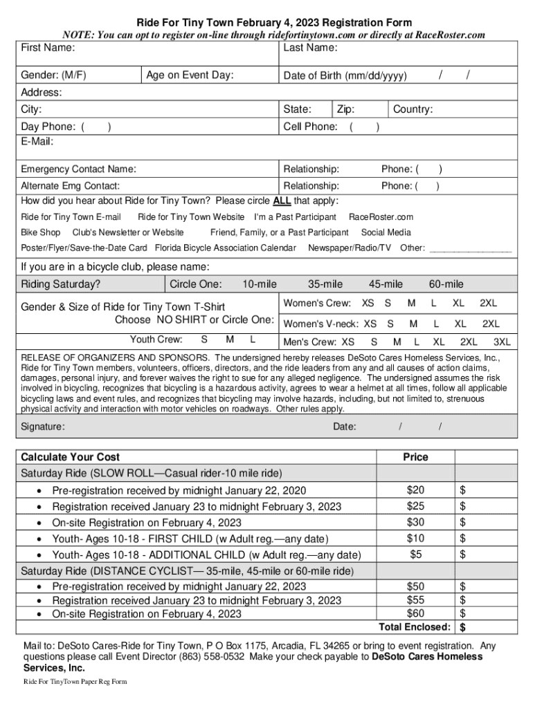 Ride For Tiny Town February 4, 2023, Registration Form NOTE: You can opt to register online through ridefortinytown.com or directly at RaceRoster.com First Name: Last Name: Gender: (M/F)Age on Event