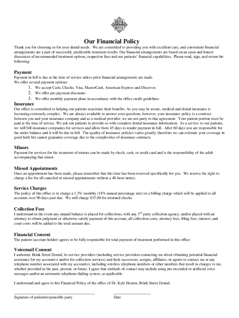 Our Financial Policy Thank you for choosing us for your dental needs. We are committed to providing you with excellent care, and convenient financial arrangements are a part of successful, predictable