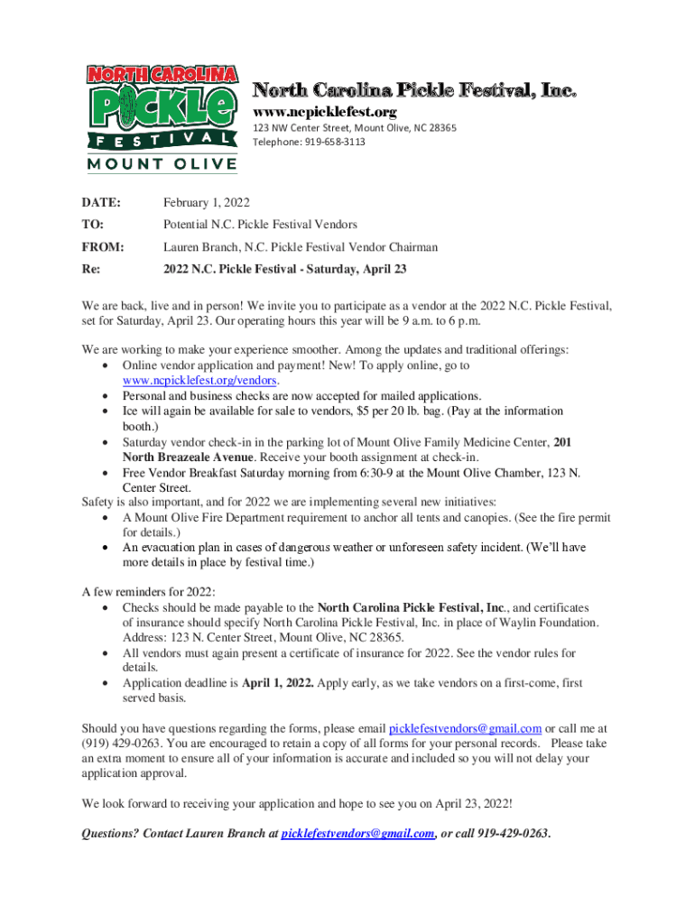 Telephone: 9196583113DATE:February 1, 2022TO:Potential N.C. Pickle Festival VendorsFROM:Lauren