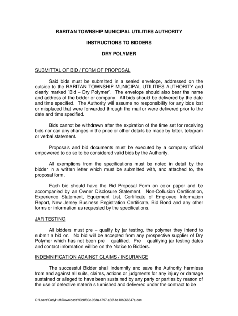 MARITAL TOWNSHIP MUNICIPAL UTILITIES AUTHORITY INSTRUCTIONS TO BIDDERS DRY POLYMERSUBMITTAL OF BID / FORM OF PROPOSAL Said bids must be submitted in a sealed envelope, addressed on the outside to