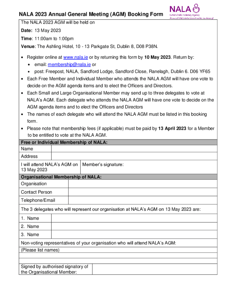 NASA 2023 Annual General Meeting (AGM) Booking Form The NASA 2023 AGM will be held on Date: 13 May 2023 Time: 11:00am to 1:00pm Venue: The Ashing Hotel, 10 13 Park gate St, Dublin 8, D08 P38N. Register