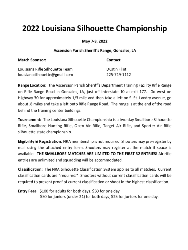 2022 Louisiana Silhouette Championship May 78, 2022 Ascension Parish Sheriffs Range, Gonzales, LA Match Sponsor:Contact:Louisiana Rifle Silhouette Team louisianasilhouette@gmail.comDustin Flint 2257191112Range