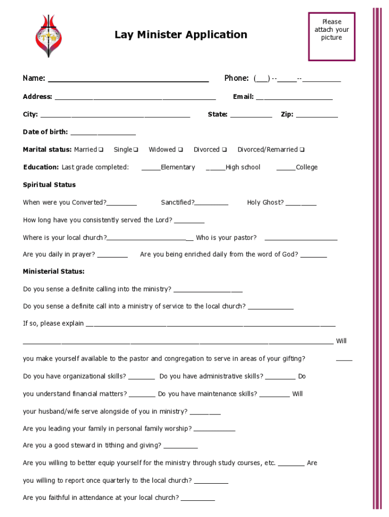 Lay Minister ApplicationName:Phone: (Address: ___ City: ___) Email: ___State: ___Zip: ___Date of birth: ___ Marital status: Married Single Education: Last grade completed:Widowed Divorced ___ElementaryDivorced/Remarried