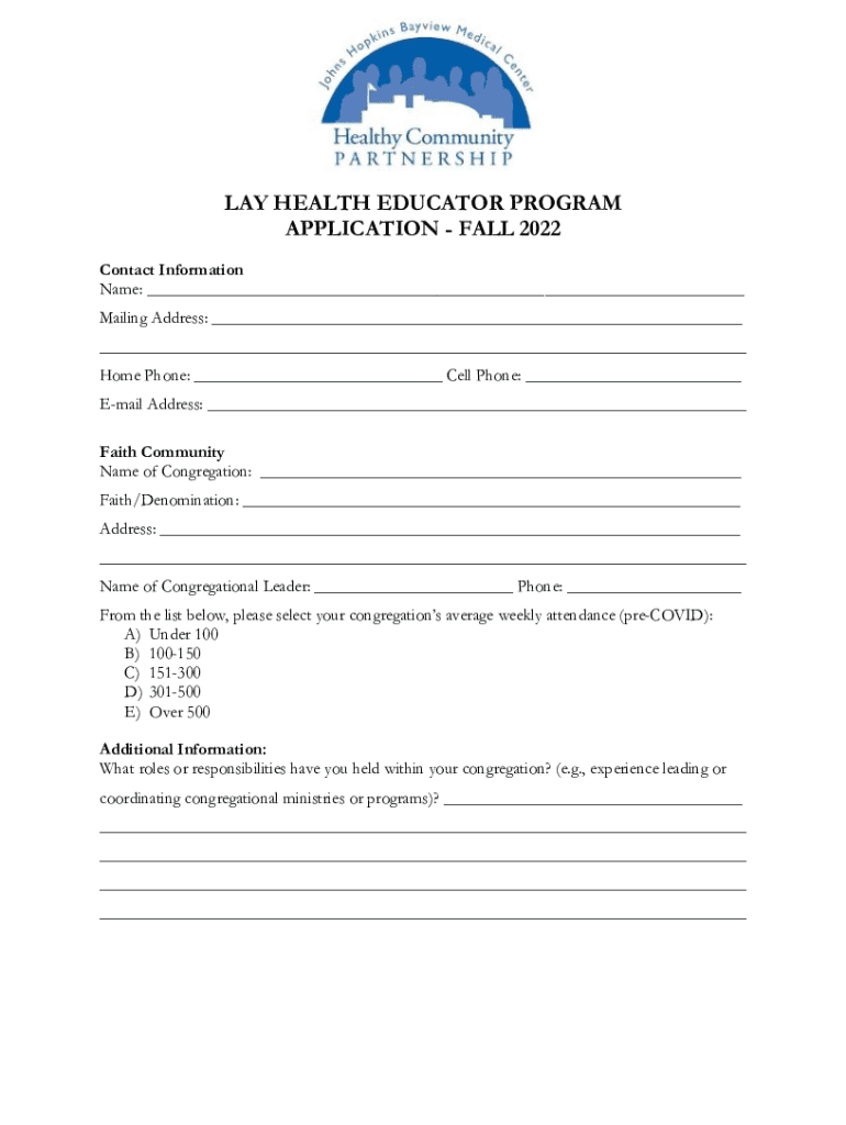 LAY HEALTH EDUCATOR PROGRAM APPLICATION FALL 2022 Contact Information Name: ___ Mailing Address: ___ ___ Home Phone: ___ Cell Phone: ___ Email Address: ___ Faith Community Name of Congregation: ___