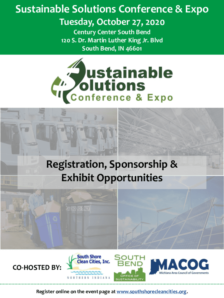 Sustainable Solutions Conference & Expo Tuesday, October 27, 2020, Century Center South Bend 120 S. Dr. Martin Luther King Jr. Blvd South Bend, IN 46601Registration, Sponsorship & Exhibit OpportunitiesCOHOSTED