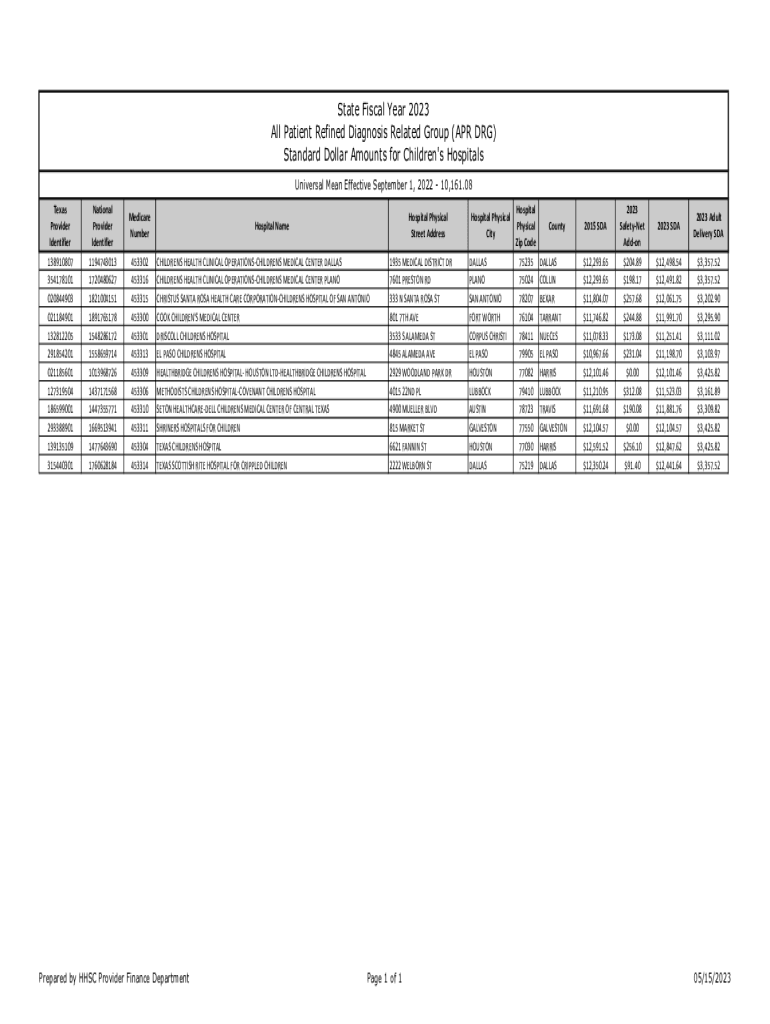 State Fiscal Year 2023 All Patient Refined Diagnosis Related Group (APR DRG) Standard Dollar Amounts for Children\'s Hospitals Universal Mean Effective September 1, 2022 10,161.08 Texas Provider IdentifierNational