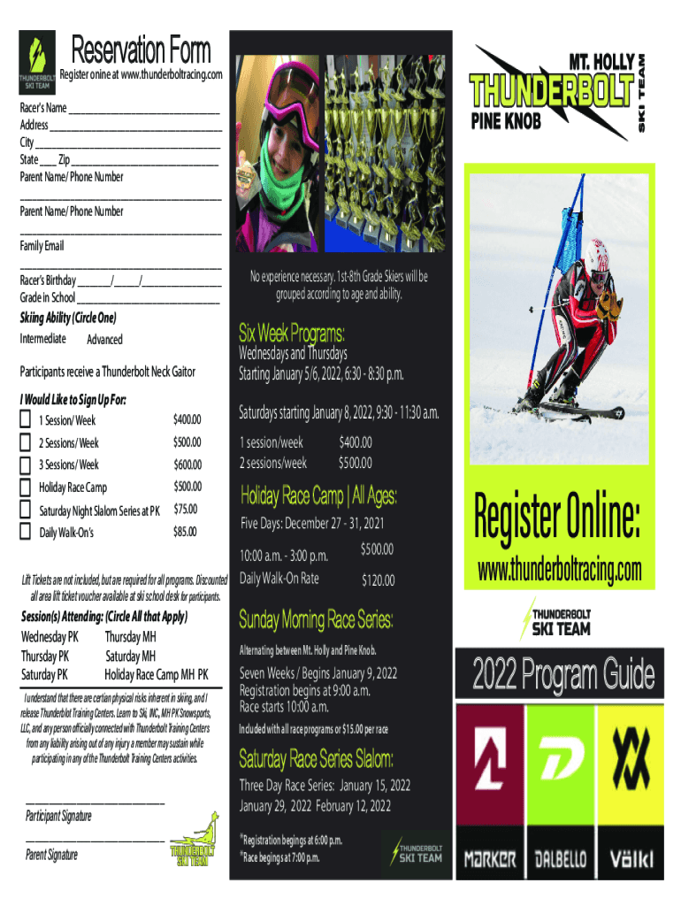 Reservation Preregister nine at www.thunderboltracing.com Racer\'s Name ___ Address ___ City ___ State ___ Zip ___ Parent Name/ Phone Number ___ Parent Name/ Phone Number ___ Family Email ___ Racers