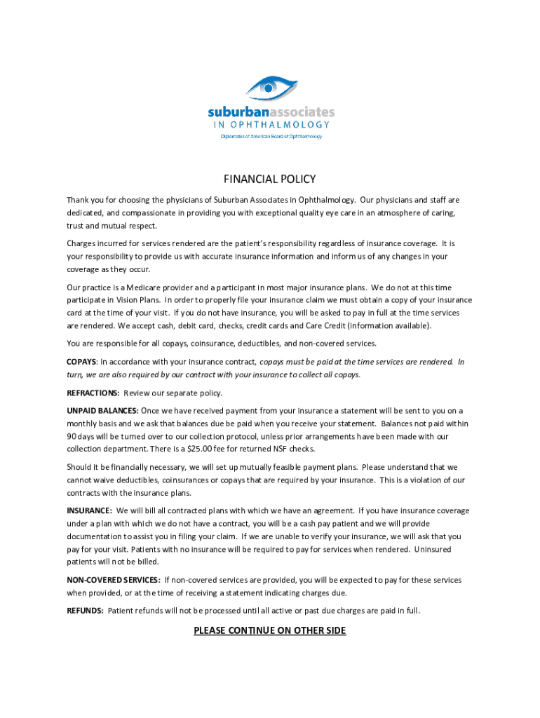 FINANCIAL POLICY Thank you for choosing the physicians of Suburban Associates in Ophthalmology. Our physicians and staff are dedicated, and compassionate in providing you with exceptional quality