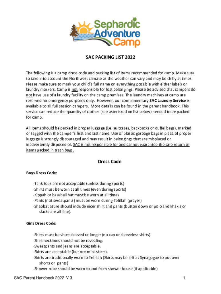 SAC PACKING LIST 2022 The following is a camp dress code and packing list of items recommended for camp. Make sure to take into account the Northwest climate as the weather can vary and may be chilly
