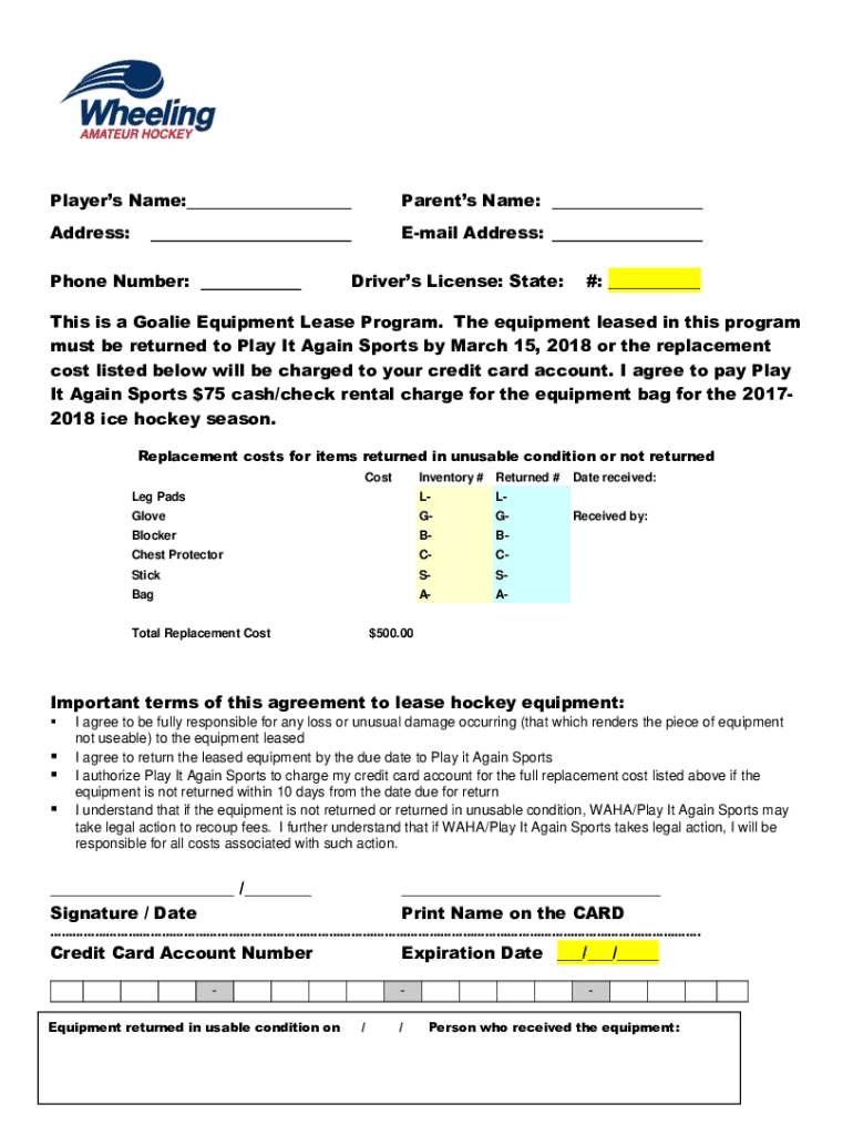 Players Name:Parents Name:Address:Email Address:Phone Number:Driver's License: State:#: ___This is a Goalie Equipment Lease Program. The equipment leased in this program must be returned to Play It