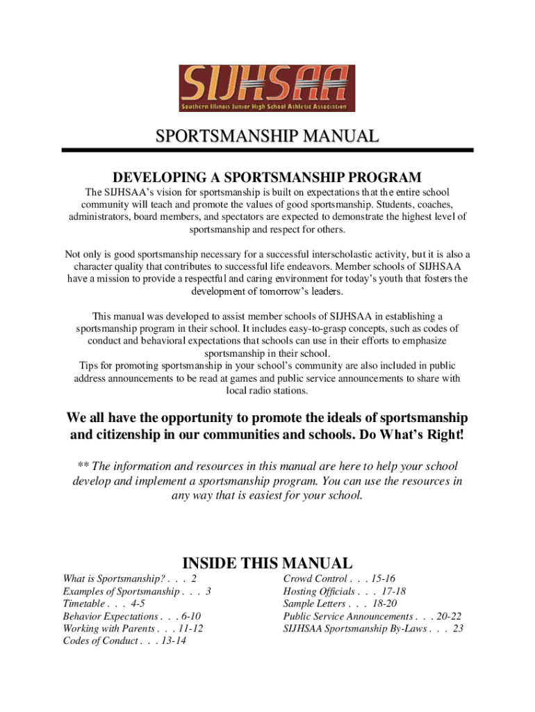 SPORTSMANSHIP MANUAL DEVELOPING A SPORTSMANSHIP PROGRAM The Siestas vision for sportsmanship is built on expectations that the entire school community will teach and promote the values of good sportsmanship.