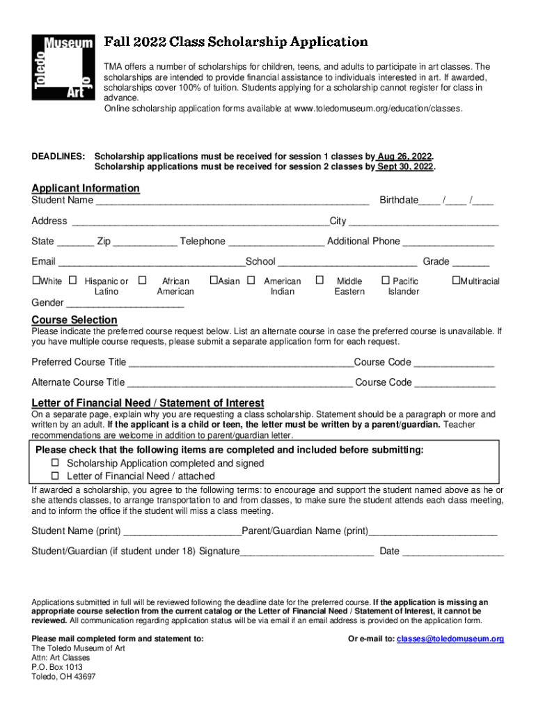 TMA offers a number of scholarships for children, teens, and adults to participate in art classes. The scholarships are intended to provide financial assistance to individuals interested in art. If
