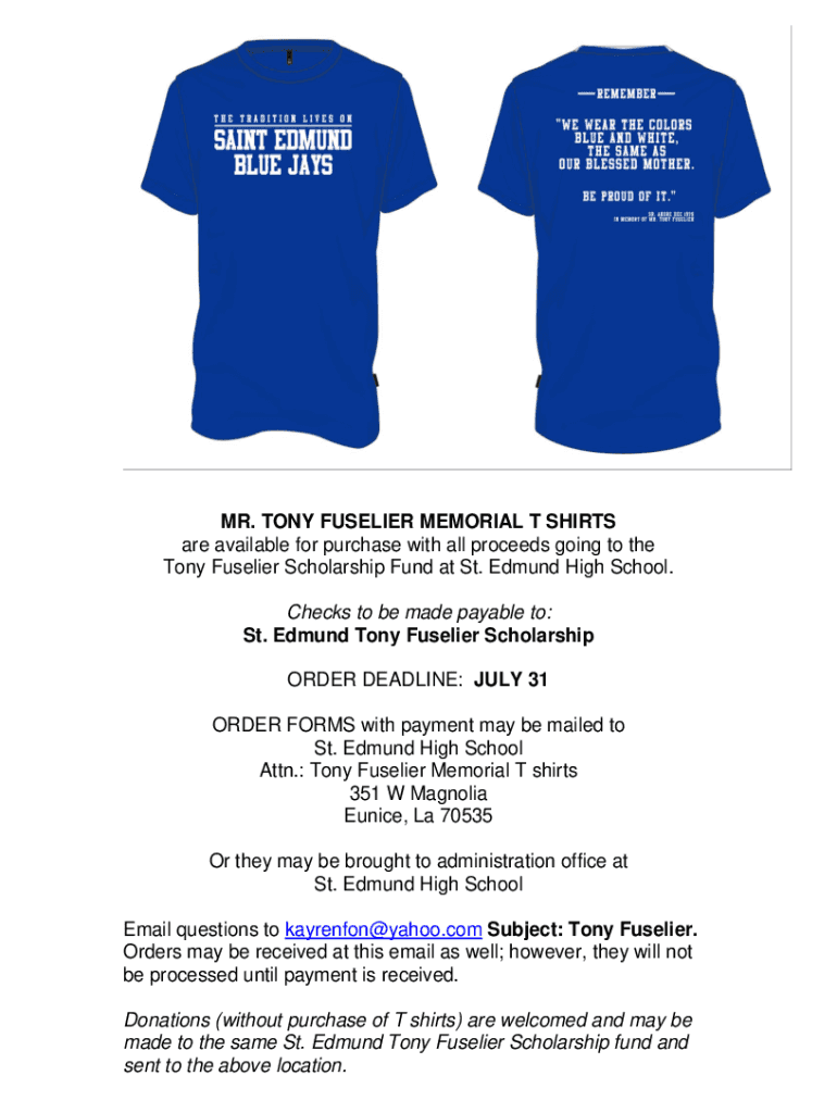 MR. TONY FUSILIER MEMORIAL T SHIRTS are available for purchase with all proceeds going to the Tony Fusilier Scholarship Fund at St. Edmund High School. Checks to be made payable to: St. Edmund Tony