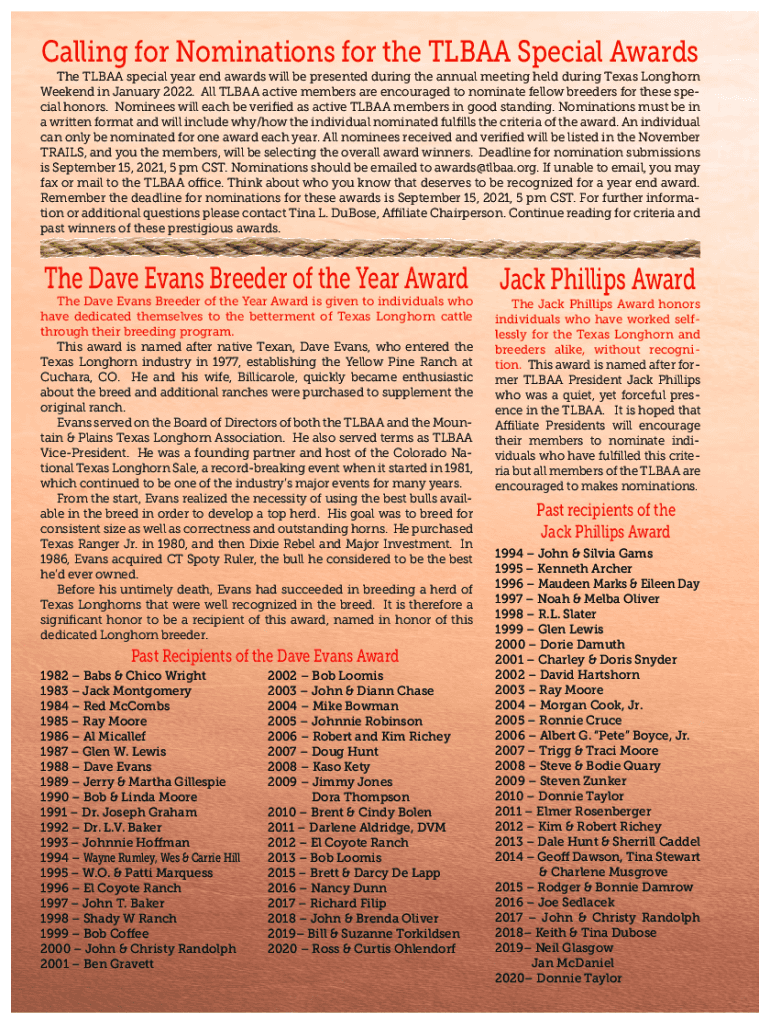 Calling for Nominations for the TL BAA Special Awards The TL BAA special year-end awards will be presented during the annual meeting held during Texas Longhorn Weekend in January 2022. All TL BAA