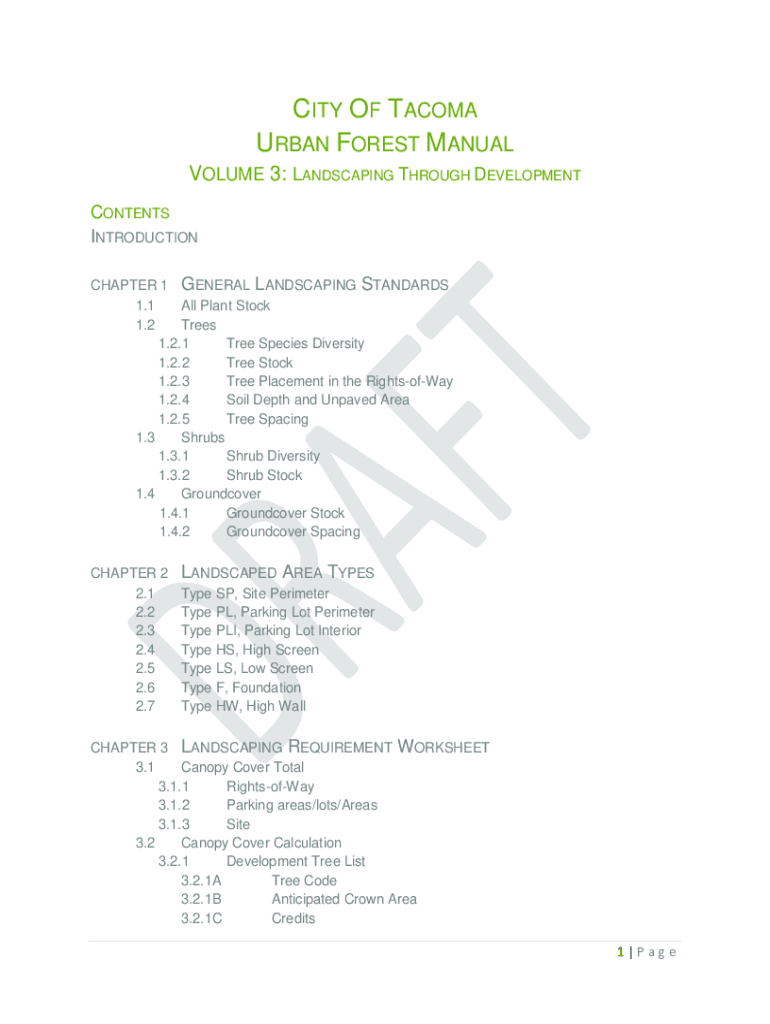CITY OF TACOMA URBAN FOREST MANUAL VOLUME 3: LANDSCAPING THROUGH DEVELOPMENT CONTENTS INTRODUCTION CHAPTER 1 GENERAL LANDSCAPING STANDARDS 1.1 All Plant Stock 1.2 Trees 1.2.1 Tree Species Diversity