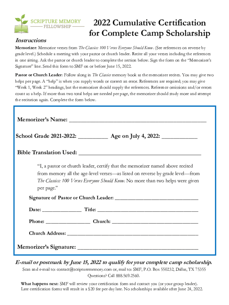 Instructions2022 Cumulative Certification for Complete Camp ScholarshipMemorizer: Memorize verses from The Classics: 100 Verses Everyone Should Know. (See references on reverse by grade level.) Schedule