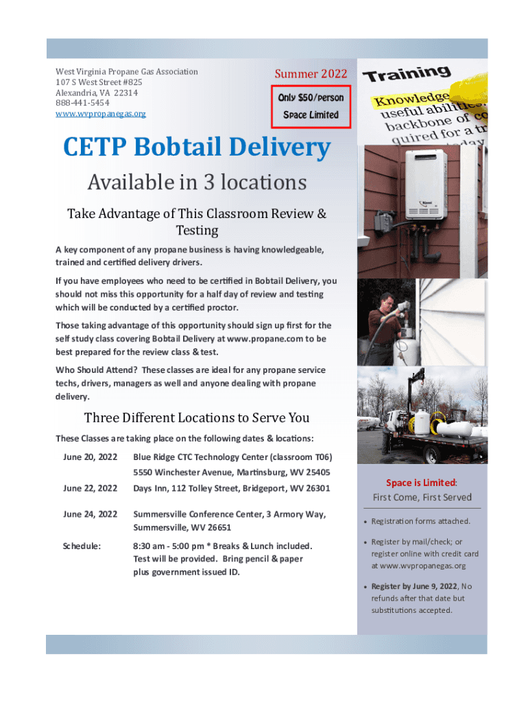 West Virginia Propane Gas Association 107 S West Street #825 Alexandria, VA 22314 8884415454 www.wvpropanegas.orgSummer 2022 Only $50/person Space LimitedCETP Bobtail DeliveryAvailable in 3 locations