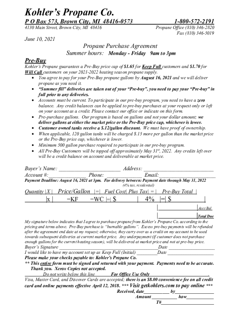 Kohler Propane Co. P O Box 573, Brown City, MI 484160573 4130 Main Street, Brown City, MI 4841618005722191 Propane Office (810) 3462820 Fax (810) 3465019June 10, 2021Propane Purchase Agreement Summer