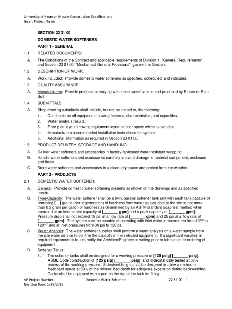 University of Houston Master Construction Specifications Insert Project Name SECTION 22 31 00 DOMESTIC WATER SOFTENERS PART 1 GENERAL 1.1 A. 1.2 A. 1.3 A. 1.4 A.1.5 A. B. C.RELATED DOCUMENTS: The