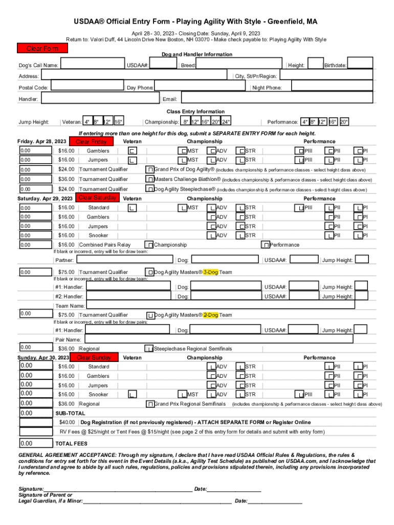 USDA Official Entry Form Playing Agility With Style Greenfield, MA April 28 30, 2023 Closing Date: Sunday, April 9, 2023, Return to: Valor Duff, 44 Lincoln Drive New Boston, NH 03070 Make check payable