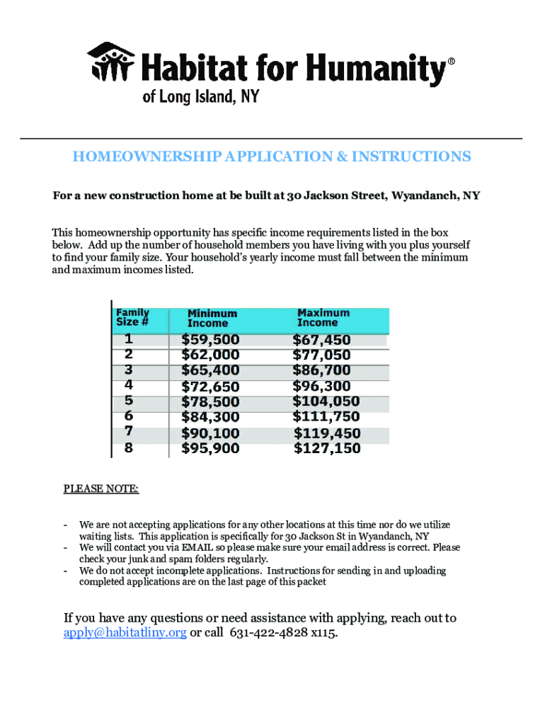 HOMEOWNERSHIP APPLICATION & INSTRUCTIONS For a new construction home at be built at 30 Jackson Street, Wyandanch, NY This homeownership opportunity has specific income requirements listed in the box