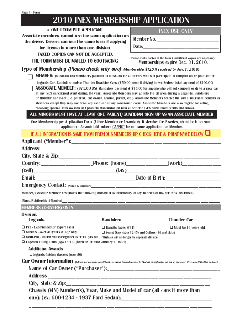 Page 1 Form I2010 INDEX MEMBERSHIP APPLICATION ONE FORM PER APPLICANT. INDEX USE ONLY Associate members cannot use the same application as the driver. Drivers can use the same form if applying Member
