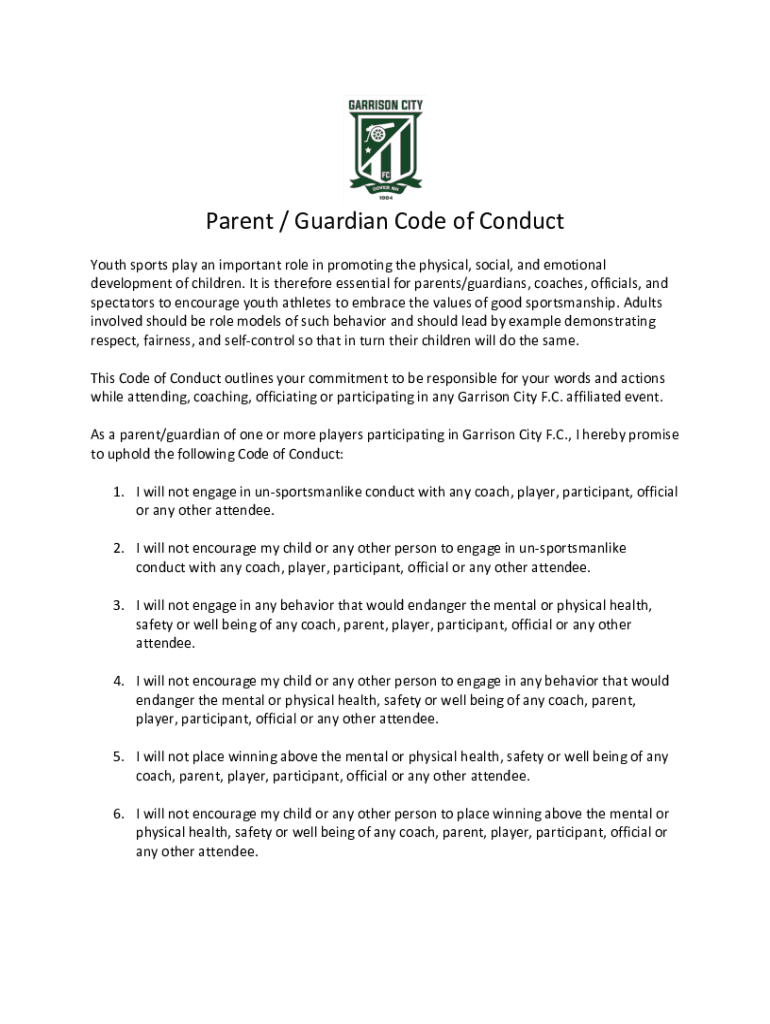 Parent / Guardian Code of Conduct Youth sports play an important role in promoting the physical, social, and emotional development of children. It is therefore essential for parents/guardians, coaches,