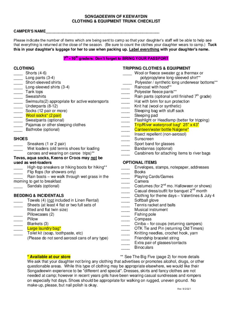 CLOTHING & EQUIPMENT TRUNK CHECKLIST