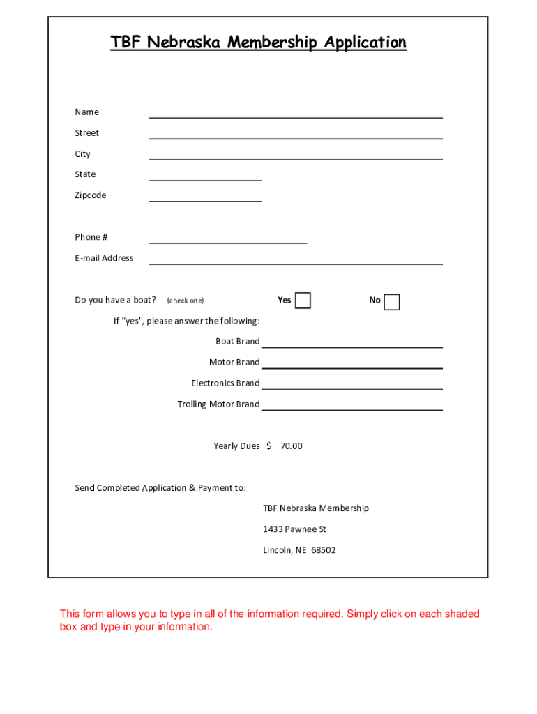 TBF Nebraska Membership ApplicationName Street City State ZipcodePhone # Email Address you have a boat? Yes(check one)Coif \” yes\”, please answer the following: Boat Brand Motor Brand Electronics