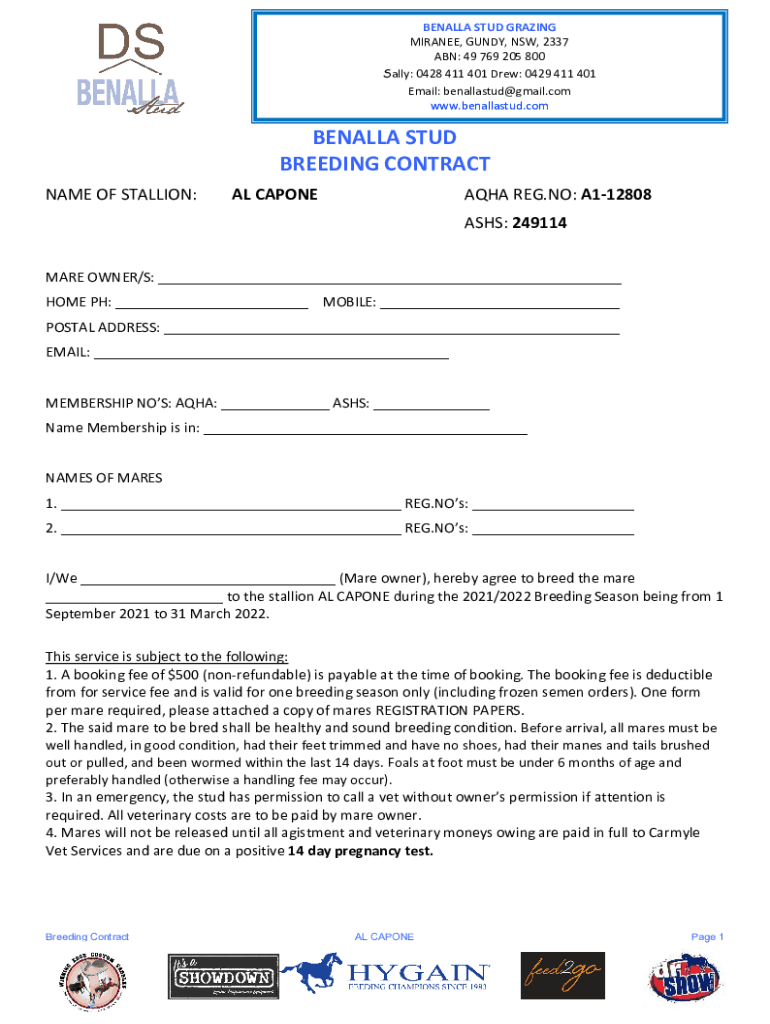 BELLA STUD GRAZING MIRACLE, GRUNDY, NSW, 2337 ABN: 49 769 205 800 Sally: 0428 411 401 Drew: 0429 411 401 Email: benallastud@gmail.com www.benallastud.comBENALLA STUD BREEDING CONTRACT NAME OF STALLION:AL