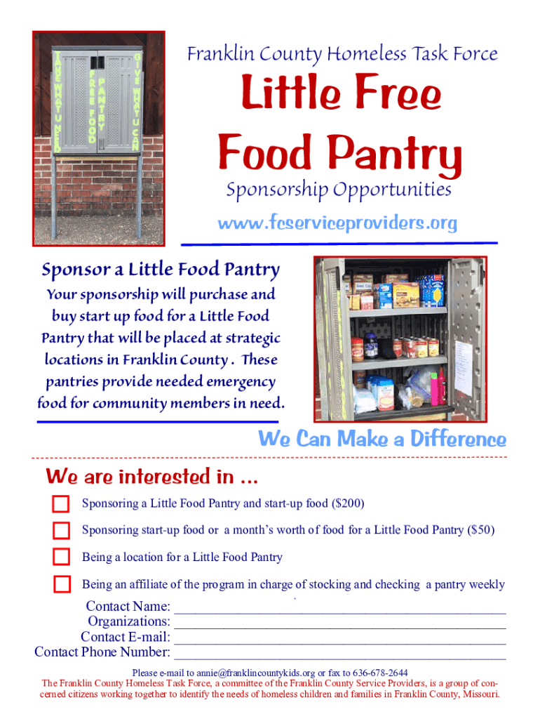 Franklin County Homeless Task Force Little Free Food Pantry Sponsorship Opportunities.fcserviceproviders.sponsor a Little Food Pantry Your sponsorship will purchase and buy start up food for a Little