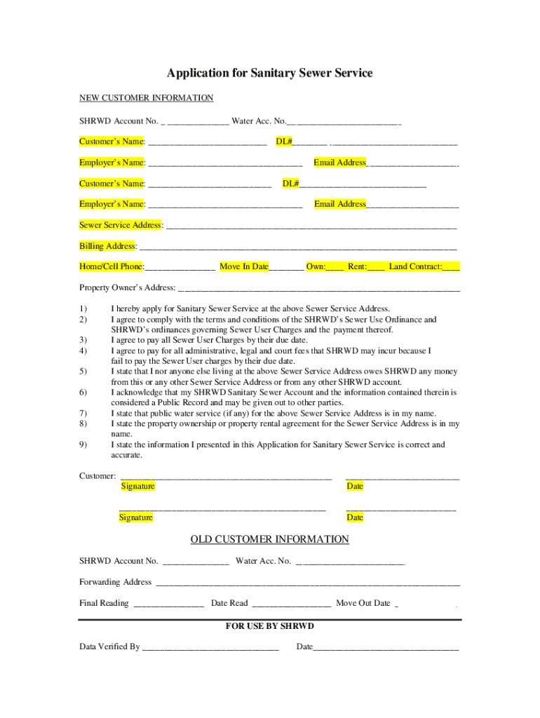 Application for Sanitary Sewer Service NEW CUSTOMER INFORMATION SHREWD Account No. _ ___ Water Acc. No.___ Customers Name: ___DL#___ ___Employers Name: ___ Customers Name: ___Email Address___DL#___Employers