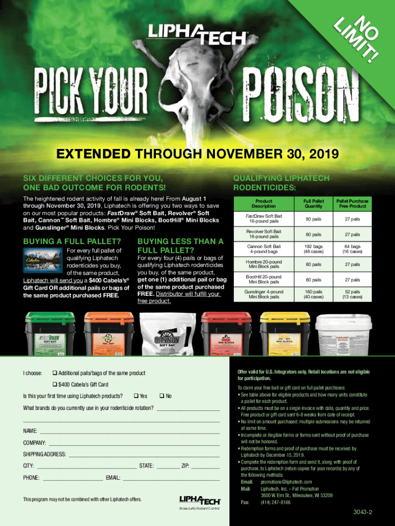 O ! N MIT LI EXTENDED THROUGH NOVEMBER 30, 2019, SIX DIFFERENT CHOICES FOR YOU, ONE BAD OUTCOME FOR RODENTS!QUALIFYING LIPHATECH RODENTICIDES:The heightened rodent activity of fall is already here!