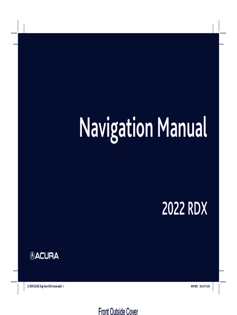 Navigation Manual 2022 RDX22 REX AKC Eng Nation Covers. Indy 18/9/2021 10:13:57 Affront Outside Comeback Outside Cover owners.acura.com (U.S.) Acura.ca (Canada)31TJB830 NM17503 00×31TJB83002022 Acura