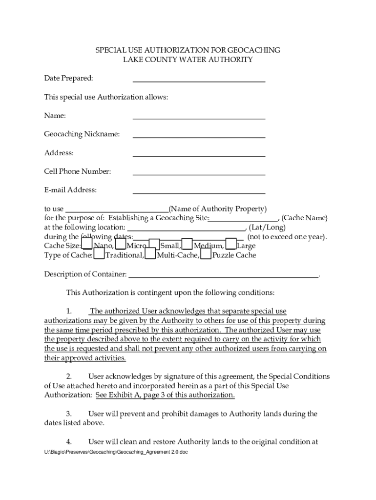 SPECIAL USE AUTHORIZATION FOR GEOCACHING