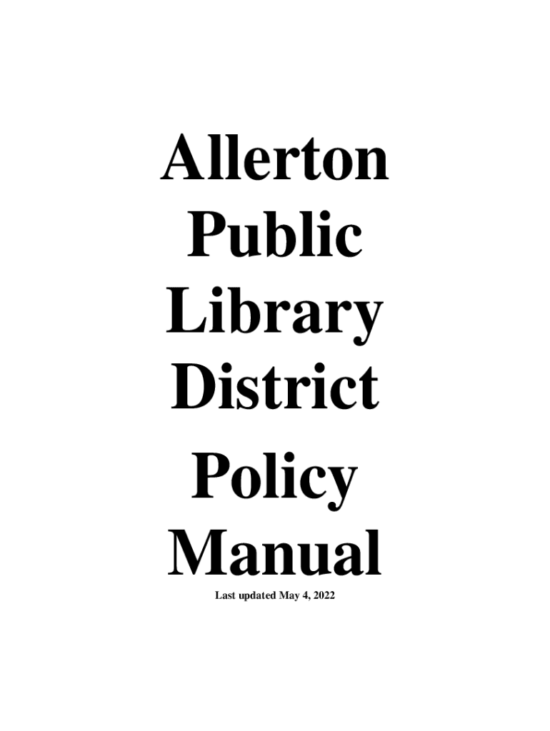 Alberto Public Library District Policy Manual Last updated May 4, 2022General Policy2General Policy The Alberto Public Library District is established and operated in compliance with the Illinois