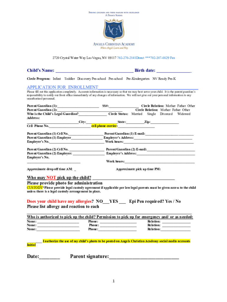 2720 Crystal Water Way Las Vegas, NV 89117 7022702141Direct ***7022070829 FaxChilds Name: ___ Birth date: ___ Circle Program: Infant Toddler Discovery Preschool PreKindergarten NV Ready Reapplication