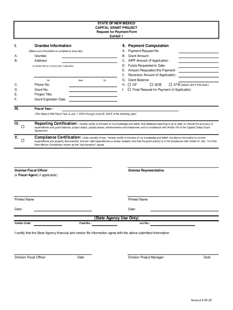 STATE OF NEW MEXICO CAPITAL GRANT PROJECT Request for Payment Form Exhibit 1I. Grantee Information. Payment Computation(Make sure information is complete & accurate)A. B. Grantee: Address: (Complete