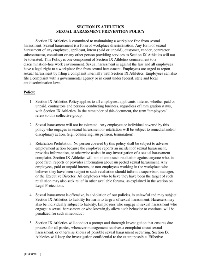 SECTION IX ATHLETICS SEXUAL HARASSMENT PREVENTION POLICY Section IX Athletics is committed to maintaining a workplace free from sexual harassment. Sexual harassment is a form of workplace discrimination.