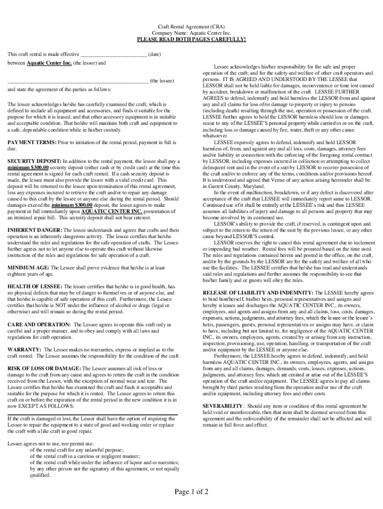 Craft Rental Agreement (CRA) Company Name: Aquatic Center Inc. PLEASE READ BOTH PAGES CAREFULLY! This craft rental is made effective ___ (date) between Aquatic Center Inc. (the lessor) and ___ (the