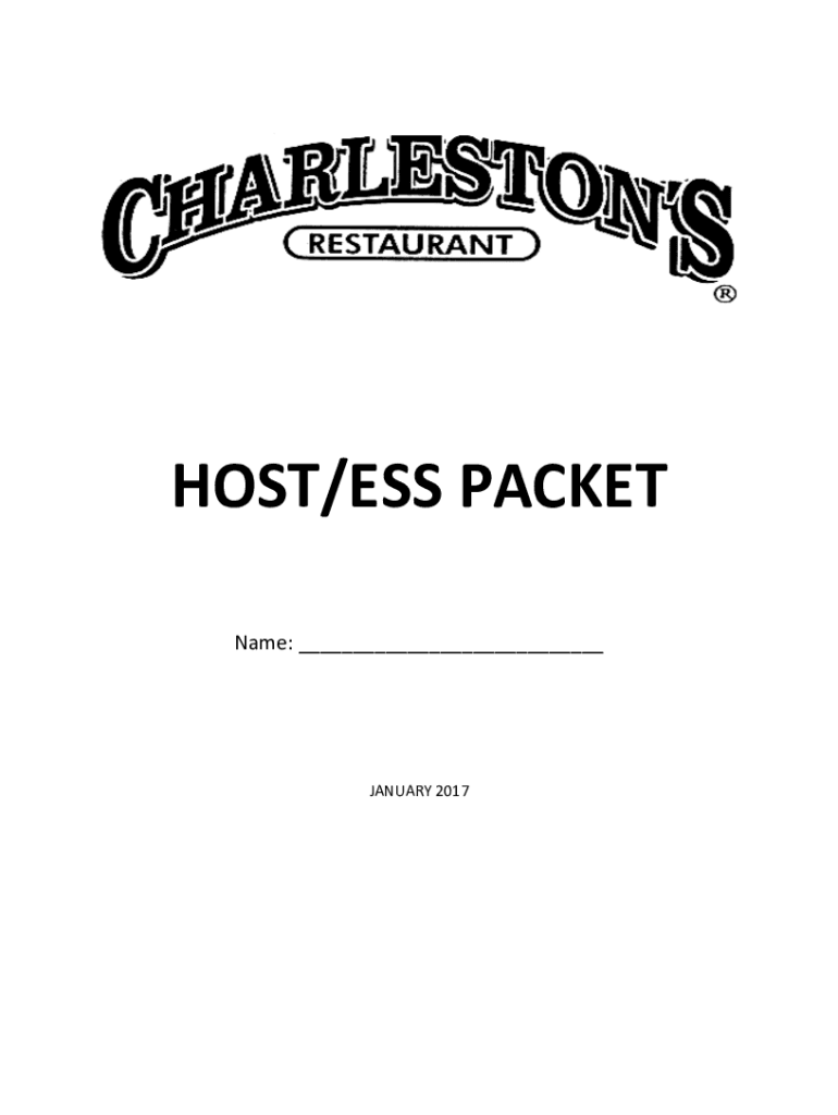HOST/ESS Packetize: ___JANUARY 2017TABLE OF CONTENTSHOST TRAINING OVERVIEW3GENERAL INFORMATION TEST4FOOD TEST5POS QUIZ7HOSTESS FINAL TEST9FLOOR SHIFT #114FLOOR SHIFT #218FLOOR SHIFT #321PERFORMANCE