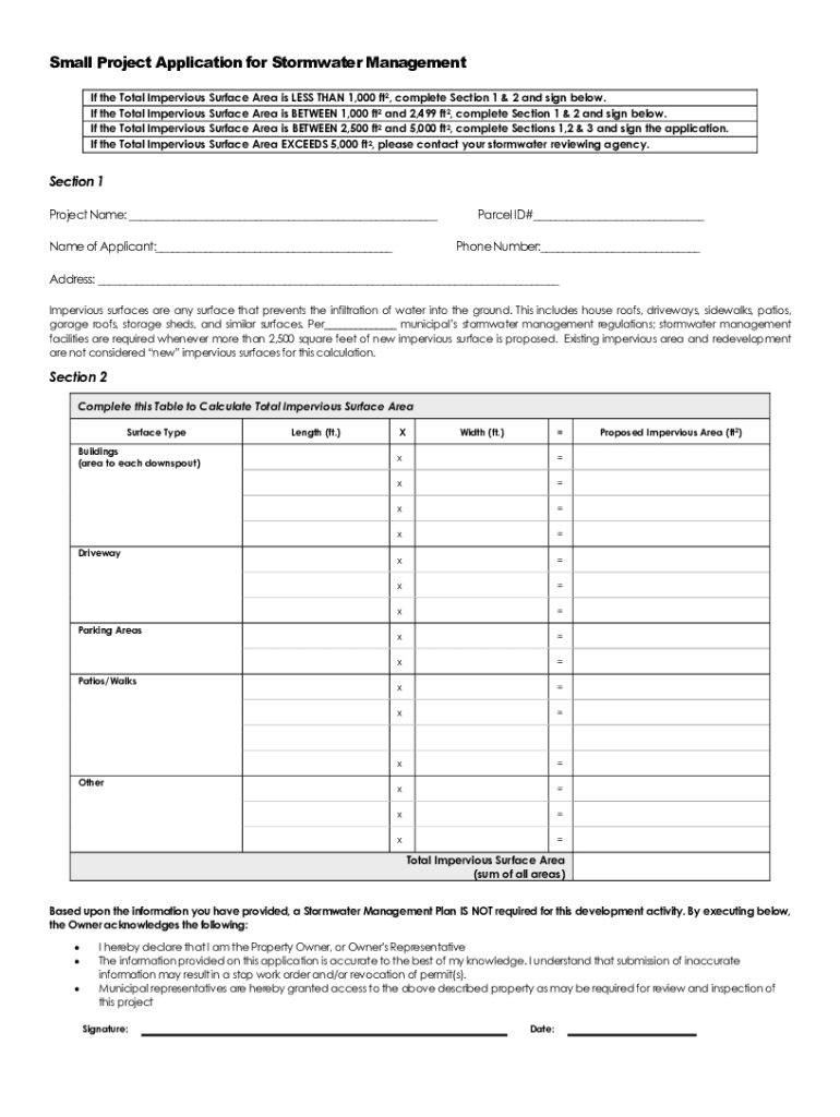 Small Project Application for Stormwater Management If the Total Impervious Surface Area is LESS THAN 1,000 ft2, complete Section 1 & 2 and sign below. If the Total Impervious Surface Area is BETWEEN