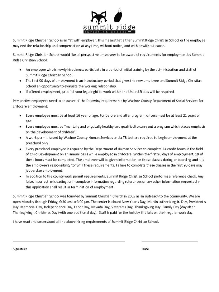Get the free Summit Ridge Christian School is an at will employer. ...